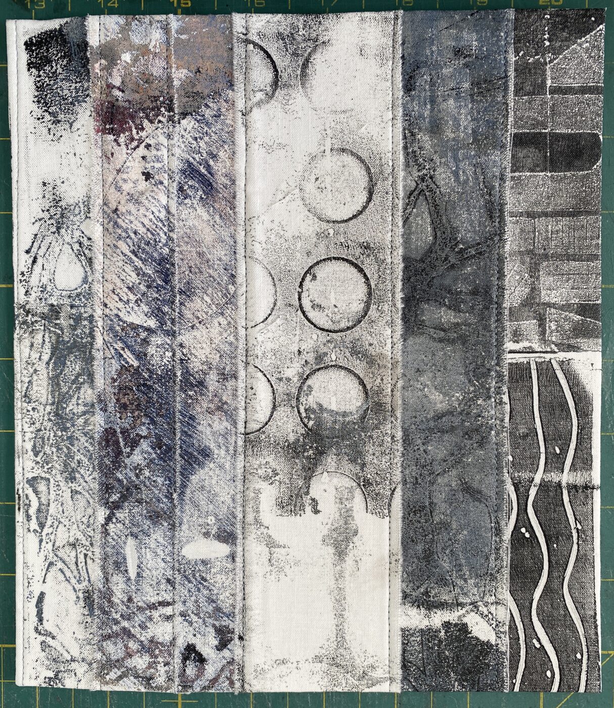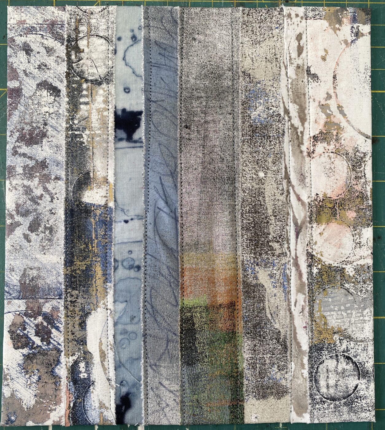 All the pages above have been made using monoprinted fabrics – ghost prints and layered ghost prints mostly and painted fabrics. Pieces I wasn’t sure I cared about or what to do with them, but torn into strips and arranged in sets, became part of an exciting new whole.